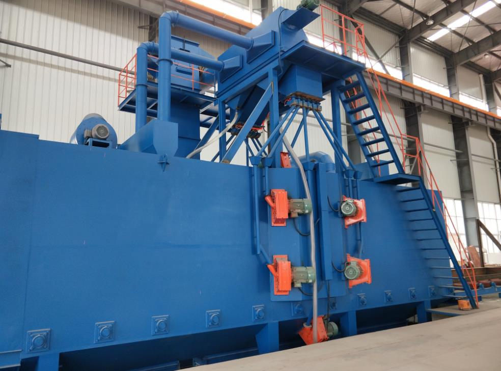 該輥道式拋丸機通常被叫做鋼板拋丸機采用雙層耐磨錳鋼護板,通過高耐磨螺帽鎖緊,對面有雙開檢修門,方便對拋丸室進行檢修維護以及護板的更換,大大提高維護性。輸送軌道采用數十根輥筒,采用鏈輪鏈條帶動輥筒輸送,傳動平穩,所有聯動機構均有保護裝置和警示提醒標志。拋丸室體緊湊密閉設計,確保無丸料飛濺現象。輥道通過式拋丸機是一種清理焊接結構件、H鋼、型鋼、網架、鋼板的多功能鋼材預處理線,對鋼板除銹拋光的處理!拋丸器布置形式為多角度,選用了上先進的單元盤葉片高效拋丸器,拋射出高速密集的彈丸束,打擊在原始狀態鋼材的各個部位,進行立體的、全方位的清理,使鋼材各表面上的銹蝕層、焊渣、氧化皮及其污物迅速脫落,獲得一定粗糙度的光潔表面,提高了漆膜與鋼材表面的附著力,并提高鋼材的抗疲勞強度和抗腐蝕能力,改善了鋼材內在質量,延長其使用壽命。輥道通過式拋丸機結構:鋼板拋丸機主要功能部件是清理室,室內輸送輥道與進出料輸送輥道、拋丸器、彈丸循環系統(含提升機、分離器、縱橫螺旋輸送器及彈丸回收機構和供丸管道)吹掃機構、除塵、電氣控制等部件組成。