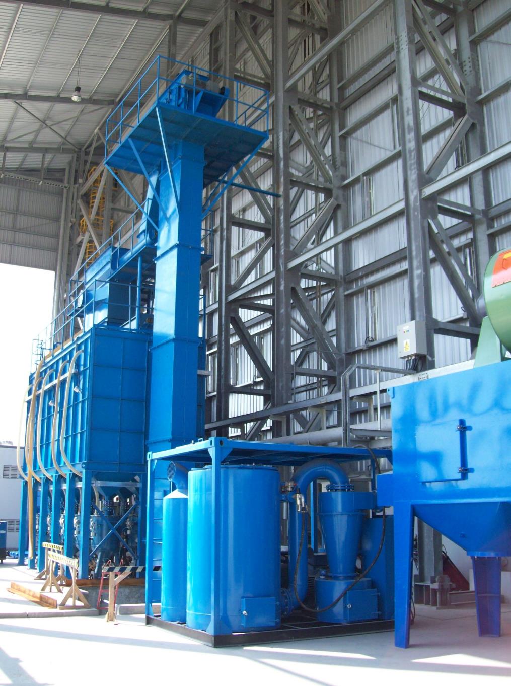 磨料運(yùn)送方式是該設(shè)備設(shè)計(jì)的另一亮點(diǎn)。除了眾所周知的需要很小安裝深度的扁平式傳送地面以外,在螺旋傳送機(jī)和振動(dòng)橫格磨料傳送技術(shù)等方面具有極其豐富的經(jīng)驗(yàn)。對(duì)于大型工件一般采用開放式噴砂。