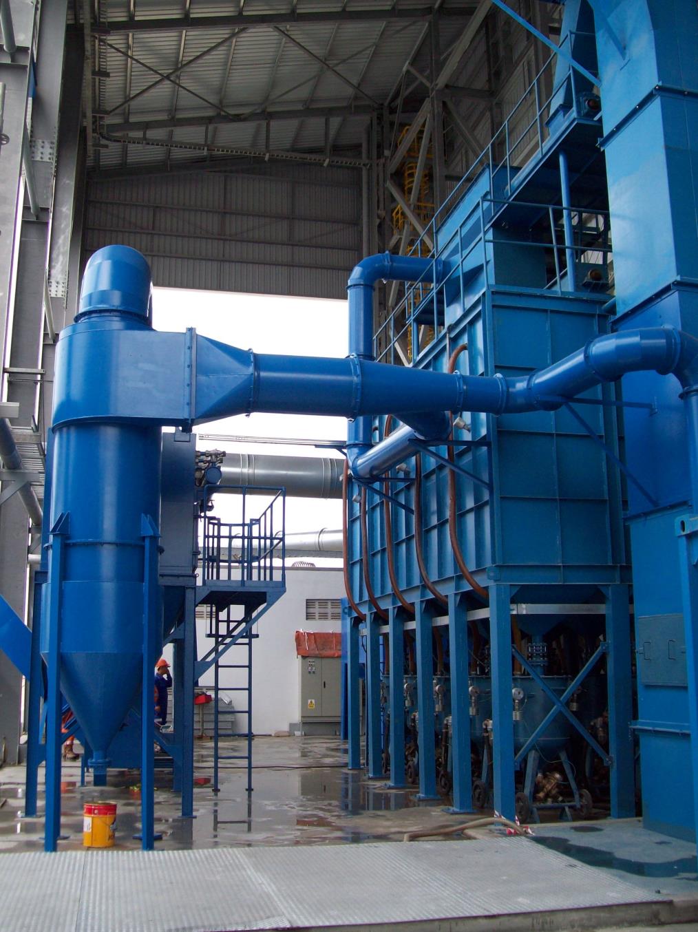 噴砂房左右兩側各配有一臺電動工作小車,方便操作員噴砂作業(yè),整個噴砂房內襯耐磨損、降噪音的橡膠襯板,兩套濾筒式除塵器用于整個噴砂房的通風與除塵,粉塵含量小于60mg/m3。一套自動丸料風選和篩選裝置可將過大或過小的廢料從介質中分選出來,落入現(xiàn)場的回收廢料儲料斗,配有自動丸料風選振動篩。同時提供作業(yè)員保護裝置,包括操作人員保護頭盔、連體防砂衣和噴砂手套、呼吸過濾器和呼吸調溫器,最大限度地保障操作人員安全、健康的工作環(huán)境。