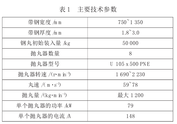 熱軋硅鋼帶在進行冷軋以前,一定要進行酸洗。酸洗的目的是除鱗、去氧化層。對硅鋼帶,一般采用拋丸酸洗法。拋丸的目的是對帶鋼表面進行連續除鱗,帶鋼表面經丸粒連續打擊,使表面氧化鐵皮松落,從而提高酸洗效果。首鋼某?;嵯礄C組用于為下游的二十輥機組提供合格的原料鋼卷,主要生產無取向高牌號硅鋼和取向硅鋼,該機組在其酸洗槽入口設置了拋丸機,該拋丸清理機是由 DISA 公司設計制造。以下主要對拋丸機的設備結構進行分析。