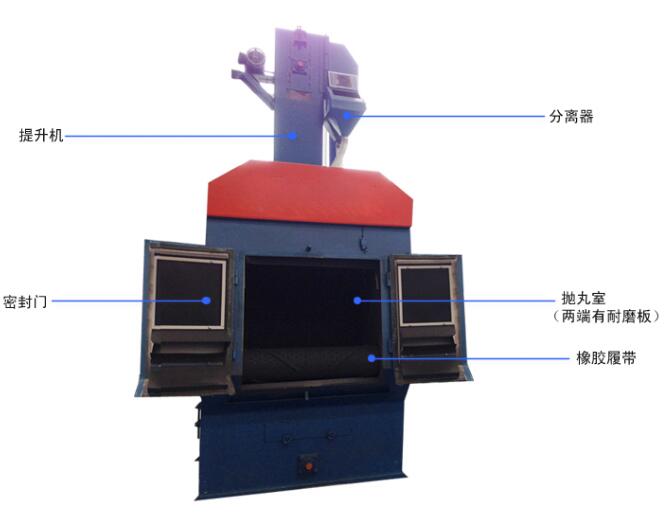 工作原理:在清理室中加入規定數量的工件,機器啟動后,工件被滾筒帶動,開始翻轉。同時拋丸器高速拋出的彈丸形成的彈束,均勻地打擊在工件表面上,從而達到清理的目的。拋出的彈九及砂粒經橡膠履帶上的小孔流入底部的鋼板網過篩,經螺旋輸送器送入提升機內,由提升機提到分離器中進行分離。粉塵由風機吸送到除塵器中過濾,清潔空氣排入大氣中,布袋上的灰塵經機械振打,落入除塵器底部的集塵箱中,用戶可定期清除,廢砂由廢料管流出,用戶可回收利用。丸砂混合物由回用管回收進入室體,待分離器分離后再回用干凈的彈丸由供丸閘門進入拋丸器拋打工件。